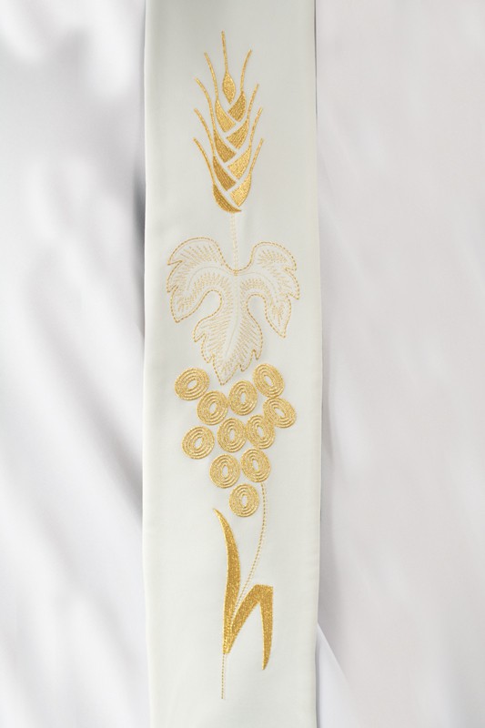 Jáhenská oboustranná štola - sv.béžová/zelená je vyrobena ze 100% polyesterové šatovky o gramáži 180g/m2, je vyšívaná křížem, klasy a vínem na zelené straně (přední i zadní díl), klasem a hroznem na béžové straně (přední i zadní díl) a také malými křížky na rameni.